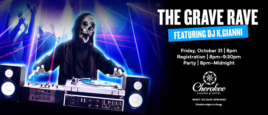 Join 98.3 KKEG at Cherokee Hotel & Casino West Siloam Springs on Friday, October 31st, for The Grave Rave—a high-energy Halloween costume throwdown with $5,000 on the line. On-site registration runs 8:00–9:30 p.m. (21+ with valid ID). The contest begins around 10:00 p.m.!
